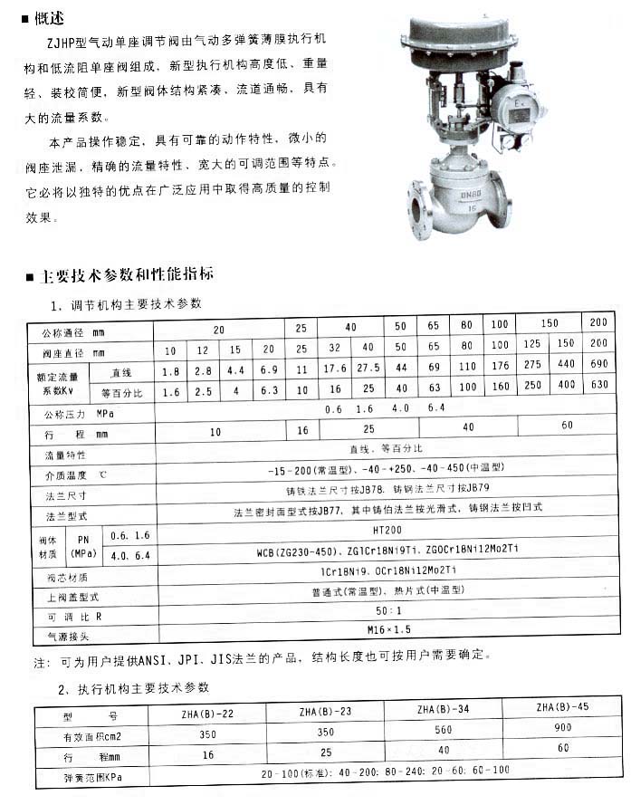ZJHP型氣動單座調節閥由氣動多彈簧薄膜執行機構和低流阻單座閥組成。新型執行機構高度低、重量輕、裝校簡便,新型閥體結構緊湊、流道通暢,具有大的流量系數。